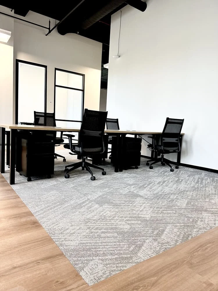 The carpet installation involved multiple design patterns that required thoughtful planning to maintain alignment and visual continuity. In addition, transitions between carpet and LVP needed to be crisp and precise to achieve a high-end appearance across adjoining office spaces.